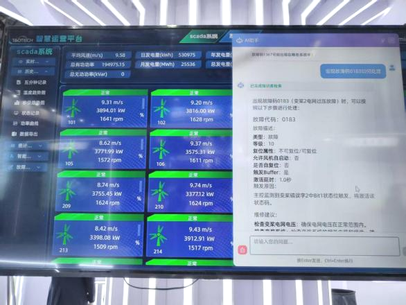 智能控制器搭載AI算法,可實(shí)現(xiàn)風(fēng)機(jī)的智能變槳與載荷優(yōu)化,有效提升發(fā)電效率,并通過預(yù)測(cè)性維護(hù)降低全生命周期運(yùn)維成本。自主智慧運(yùn)維平臺(tái)SCADA系統(tǒng)集成AI智能助手,可對(duì)風(fēng)機(jī)場(chǎng)站監(jiān)控系統(tǒng)進(jìn)行智能運(yùn)維,并通過多維度數(shù)據(jù)融合,查看故障代碼,辨別故障類型,快速獲取故障修復(fù)解決辦法。